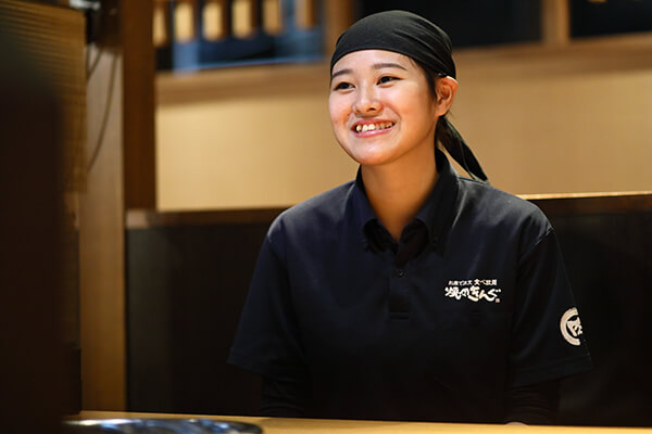 ホール担当として心がけているのは、お客さまに気持ちよく過ごしていただくこと。ホイル焼きを食べるときに手が汚れるので、おしぼりを多めにお渡しするなど、気配りをした時にお客さまが「ありがとう」と言ってくださると本当にうれしい。アンケートに「説明がていねいだった」と書いてくださる方もいらして、働きぶりをしっかり見てくれる人がいると思うとはげみになります。